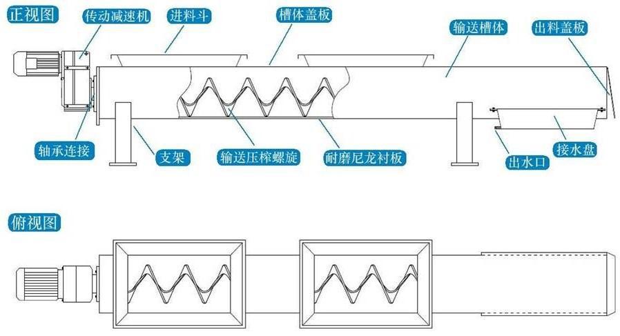 該壓榨機(jī)輸送壓榨殼體采用U型槽式結(jié)構(gòu),上部封蓋板,為增加出料高度,一般為平送出料。 壓榨螺旋采用無軸螺旋,下襯耐磨尼龍襯板,增加了輸送長度,壓榨部分為平送壓榨結(jié)構(gòu)。 可同時接受多臺格柵出料,輸送加壓榨一體,減少了動力消耗及設(shè)備投資。