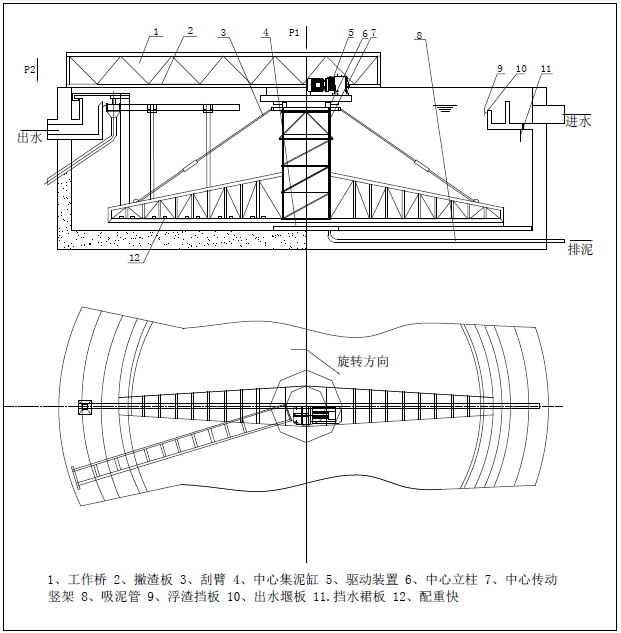 該設備采用中心傳動、垂架式,污水進入周邊配水槽內(nèi),經(jīng)槽底配水孔均勻流入池內(nèi),并在周邊擋水裙板的作用下,水流從池底流向中心,污泥依靠自重沉積于池底,從而形成泥水分離,驅(qū)動裝置驅(qū)動中心豎架旋轉(zhuǎn),并帶動刮臂及吸泥管旋轉(zhuǎn),在靜水壓力的作用下,污泥均勻地進入吸管上布置的吸口,然后通過中心排泥井的套筒閥排出池外。排泥量的大小可由套筒閥的升降度來控制,水面的浮渣通過撇清裝置撇向池邊,再由刮渣耙刮進排渣斗內(nèi)排出池外。
